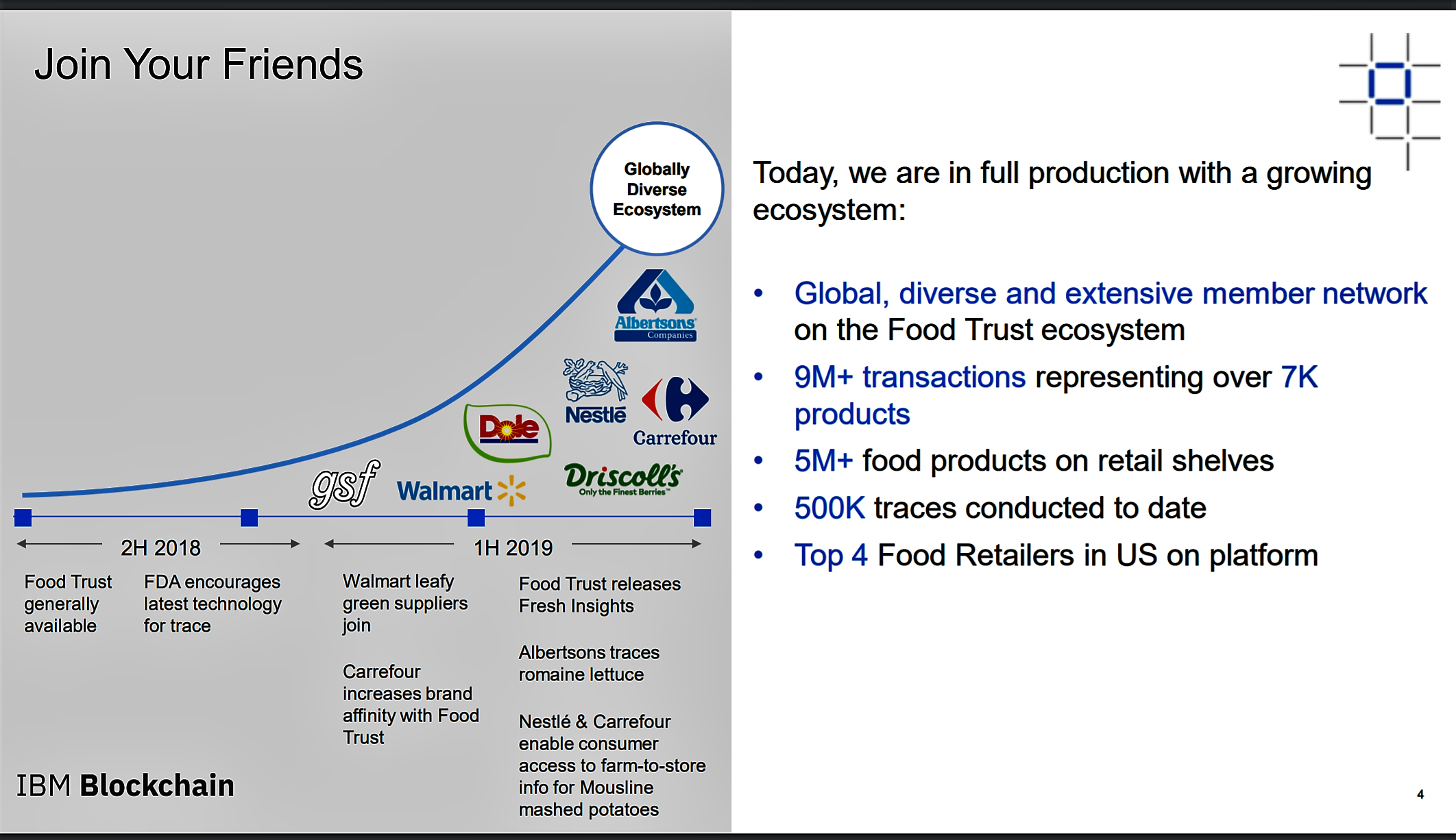 IBM's Food Trust blockchain ecosystem tracks more than 5 million products on retail shelves and 9 million transactions representing 7,000 different products, according to the company, according to Chang's presentation. It has also conducted half a million traces.