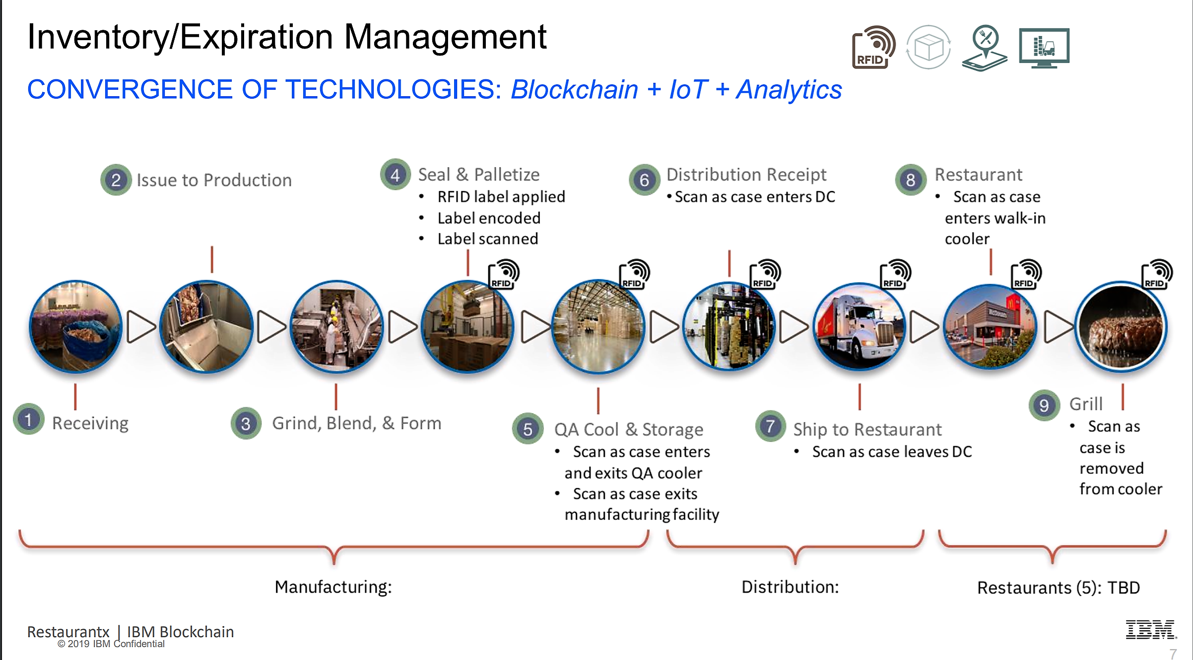 Golden State Foods, a foodservice distributor serving McDonald's, tracks the temperature of fresh beef captured using IoT sensors and RFID labeling through the McDonald's supply chain. By partnering with IBM, Golden State Foods created real-time visibility of the temperatures while product was in transit, capturing temperatures at every supply chain node.